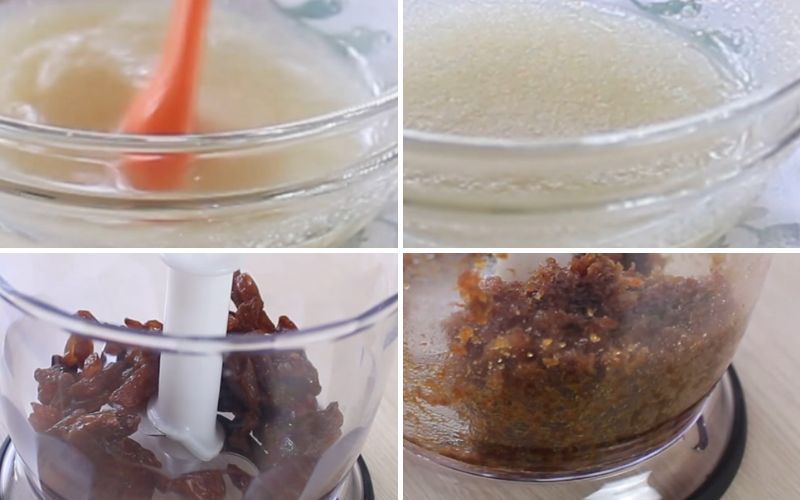 Kế đến, bạn cho 100g nho khô vào máy xay sinh tố. Xay cho nho khô nhuyễn ra.