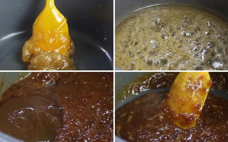Khi mạch nha tan và sôi lên, bạn cho vào 10g bơ lạt, 1 muỗng cà phê whipping cream, khuấy đều. Tiếp đến, cho phần nho đã xay nhuyễn cùng với gelatin vào, khuấy dều. Khi hỗn hợp kẹo sôi lên thì bạn cho tiếp 10g cơm dừa sấy vào. Trộn thật đều rồi tắt bếp.
