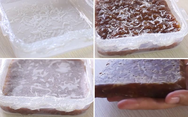 Bạn hãy lót màng bọc thực phẩm rồi giấy nến vào khuôn. Rắc thêm một lớp dừa sấy. Dàn đều phần kẹo nho vào khuôn, phủ thêm một lớp dừa sấy lên trên mặt. Phủ lên một lớp giấy nến nữa. Cho khuôn kẹo vào ngăn mát tủ lạnh khoảng 5 tiếng.
