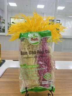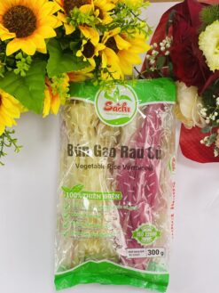 Bún Gạo Rau Củ Sachi là sản phẩm kết hợp hài hòa giữa nguyên liệu gạo và rau củ tự nhiên, mang đến món ăn giàu dinh dưỡng, vừa ngon miệng lại bổ dưỡng. Với thành phần chính từ gạo (60%), cùng các loại rau củ như củ dền, cải bó xôi, khoai lang tím, bí đỏ, và mè đen, bún gạo rau củ Sachi không chỉ có màu sắc tự nhiên đẹp mắt mà còn giữ trọn vị tươi ngon của từng nguyên liệu.