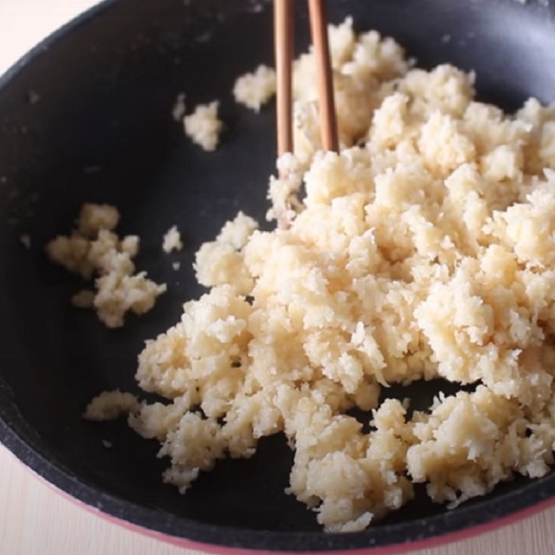 - Bạn nhấc chảo nhân ra khỏi bếp, rây đều 20g bột bánh dẻo vào trộn đều. Tiếp theo bạn cho 1ml vani nước hoặc 1/2 ống vani bột vào chảo nhân, trộn đều cho thơm.