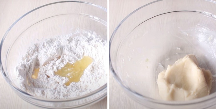 - Bạn cho vào tô 60g bột mì trộn cùng 6g bột năng, tiếp theo cho 20ml dầu ăn vào trộn cùng đến khi dầu ăn quyện với bột tạo thành hỗn hợp nửa khô nửa ướt thì bạn đeo bao tay vào nhồi sơ cho bột mềm, mịn dẻo, sờ không dính tay là được.